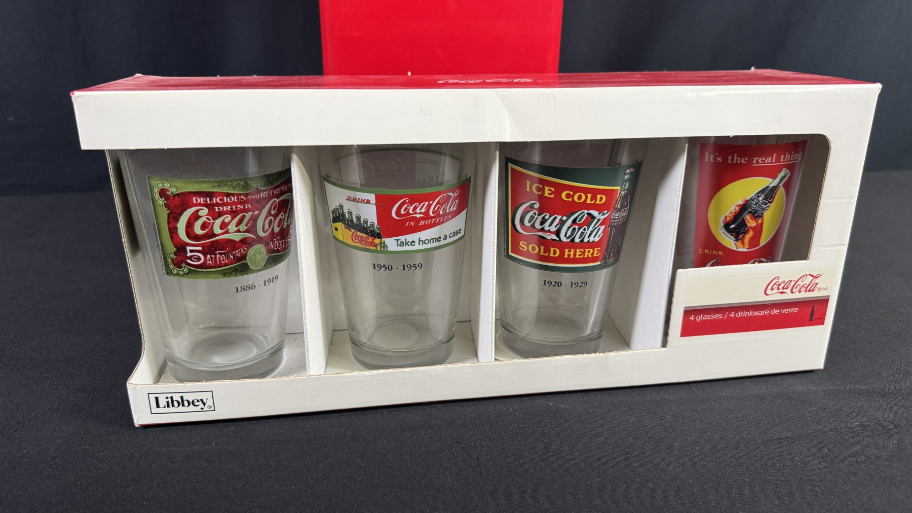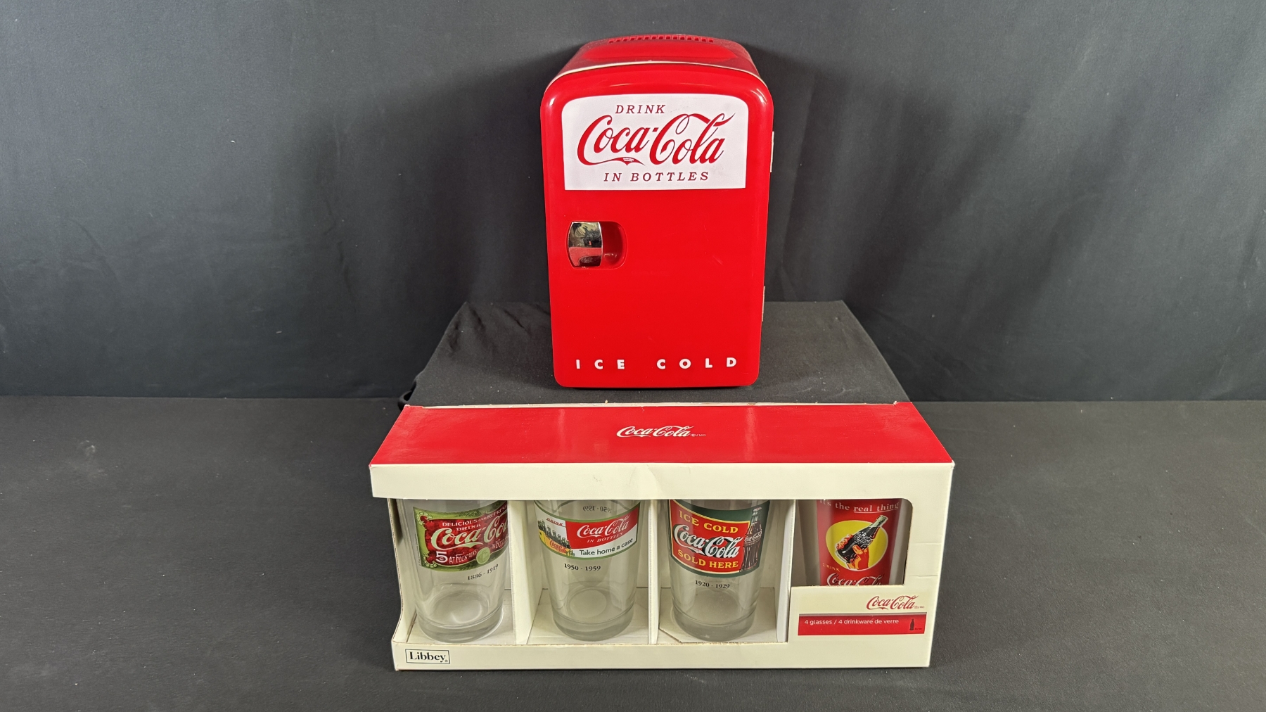 COCA-COLA MINI FRIDGE & LIBBEY COLLECTOR GLASS SET