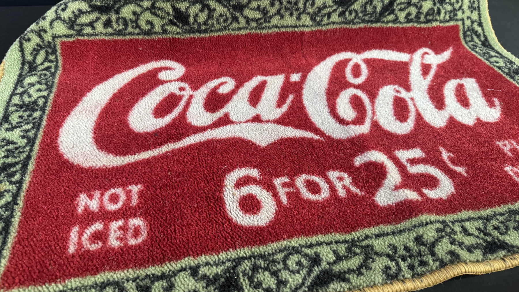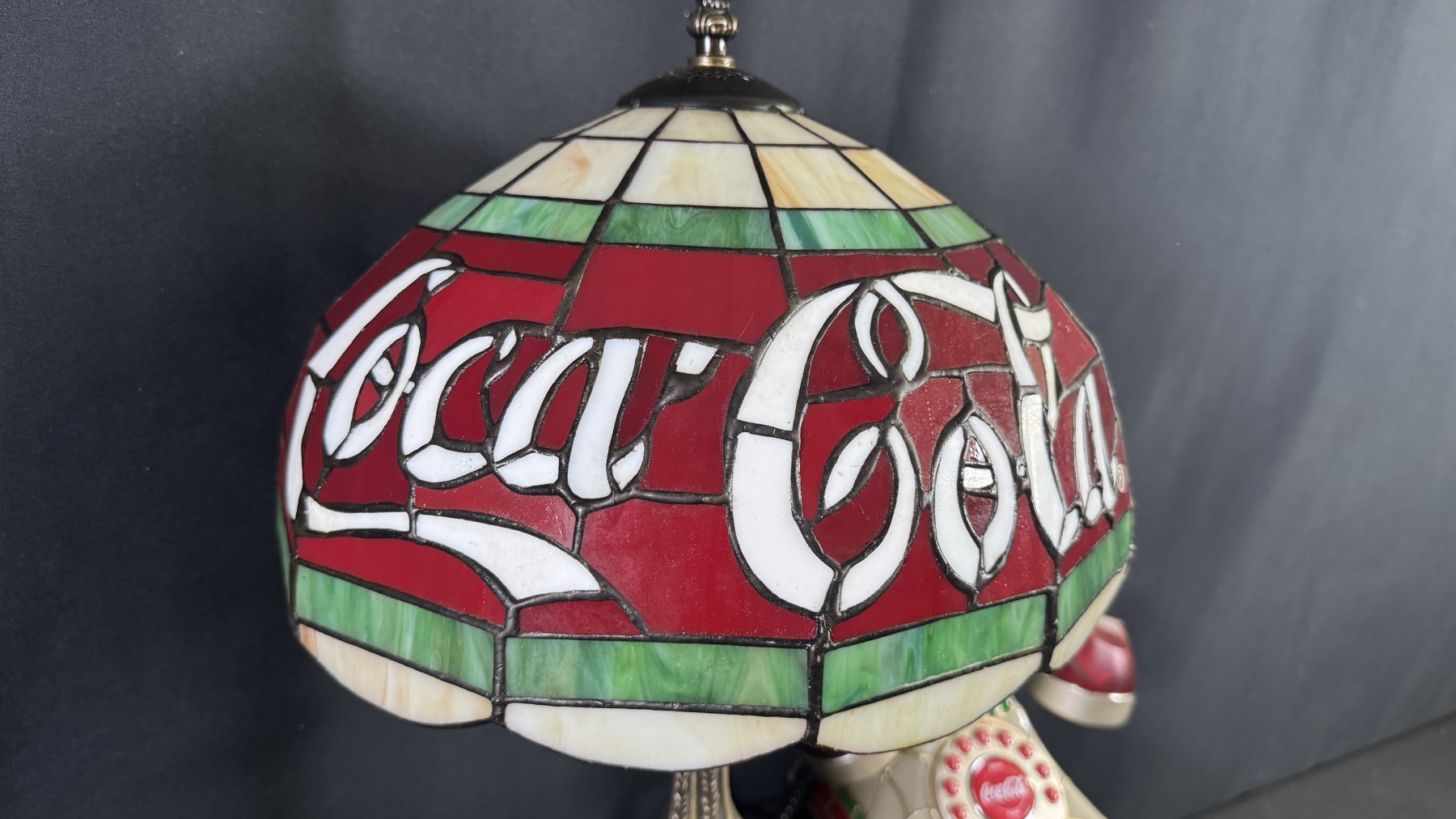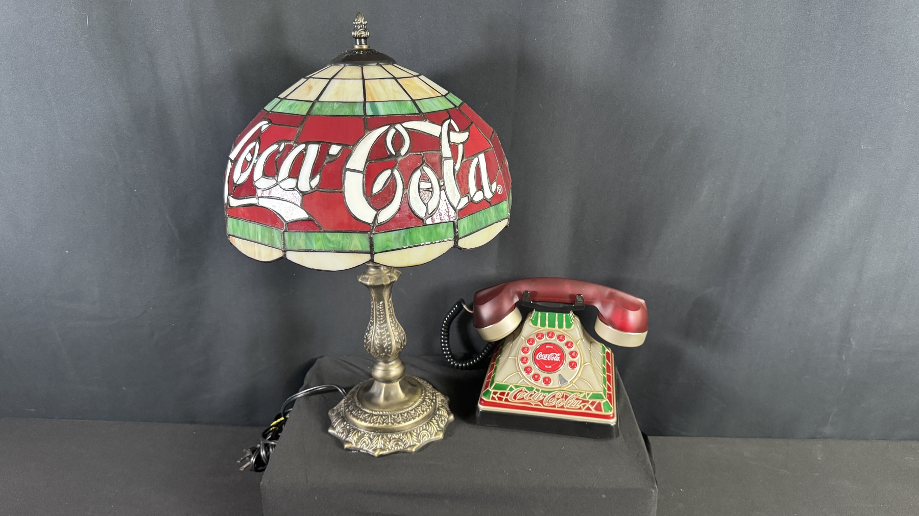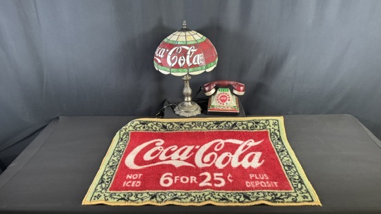COCA-COLA TIFFANY-STYLE LAMP, TELEPHONE & RUG