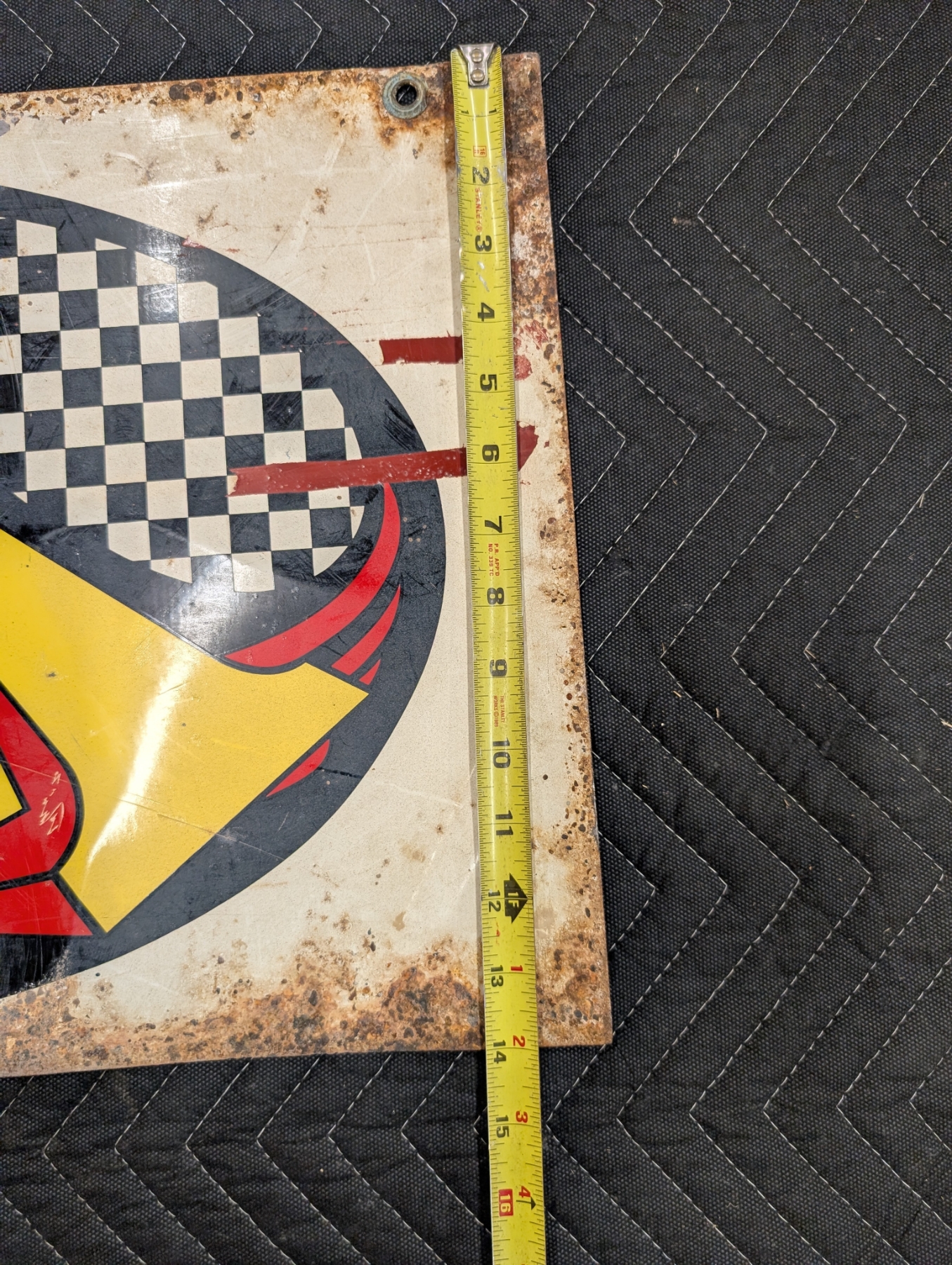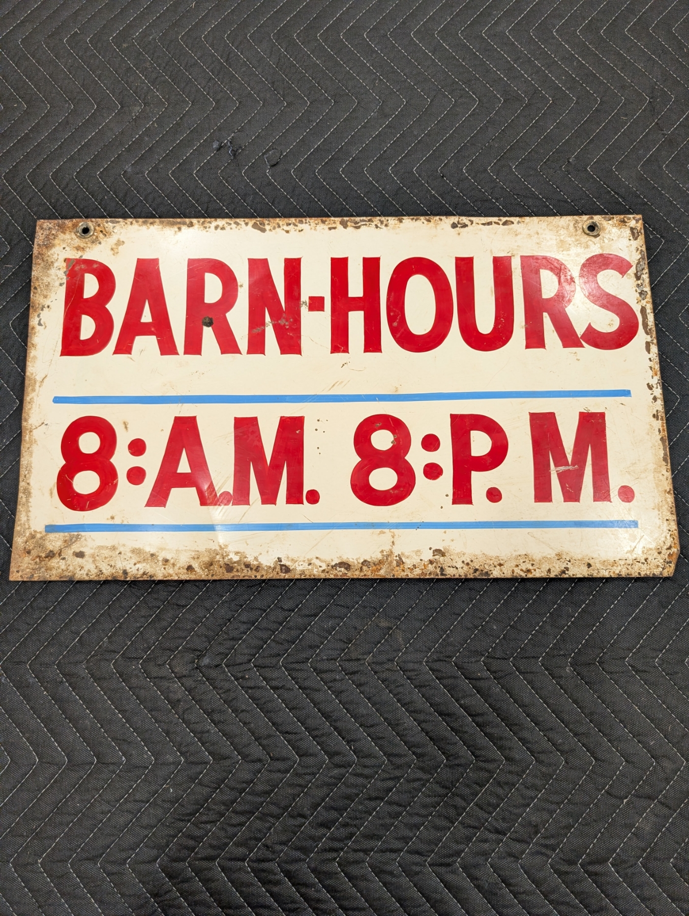 Kendall GT-1 Motor Oils station double sided Muscle car era sign! Heavy painted metal! Really cool reuse of sign painted on rear of sign. Barn hours depicted on rear. Awesome patina for that farm and muscle car enthusiast! 24 inches by 14 inches! Both grommets in place!