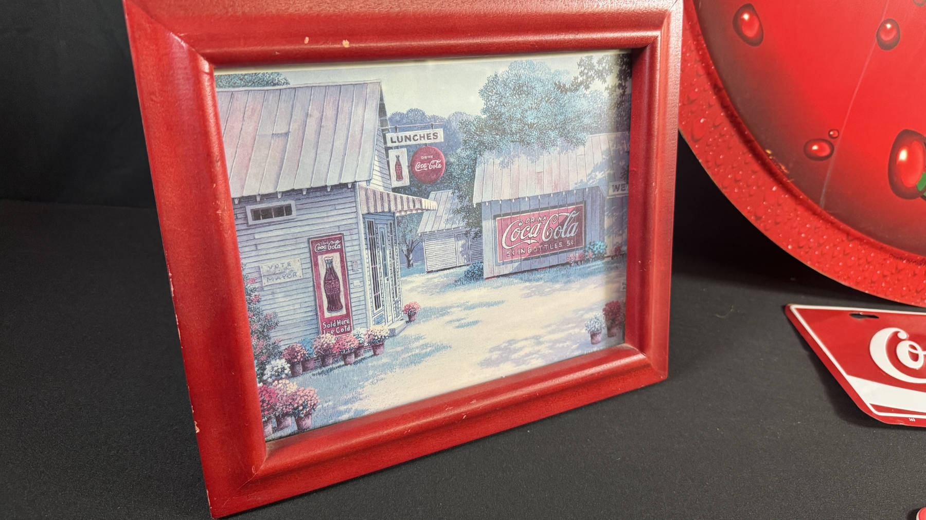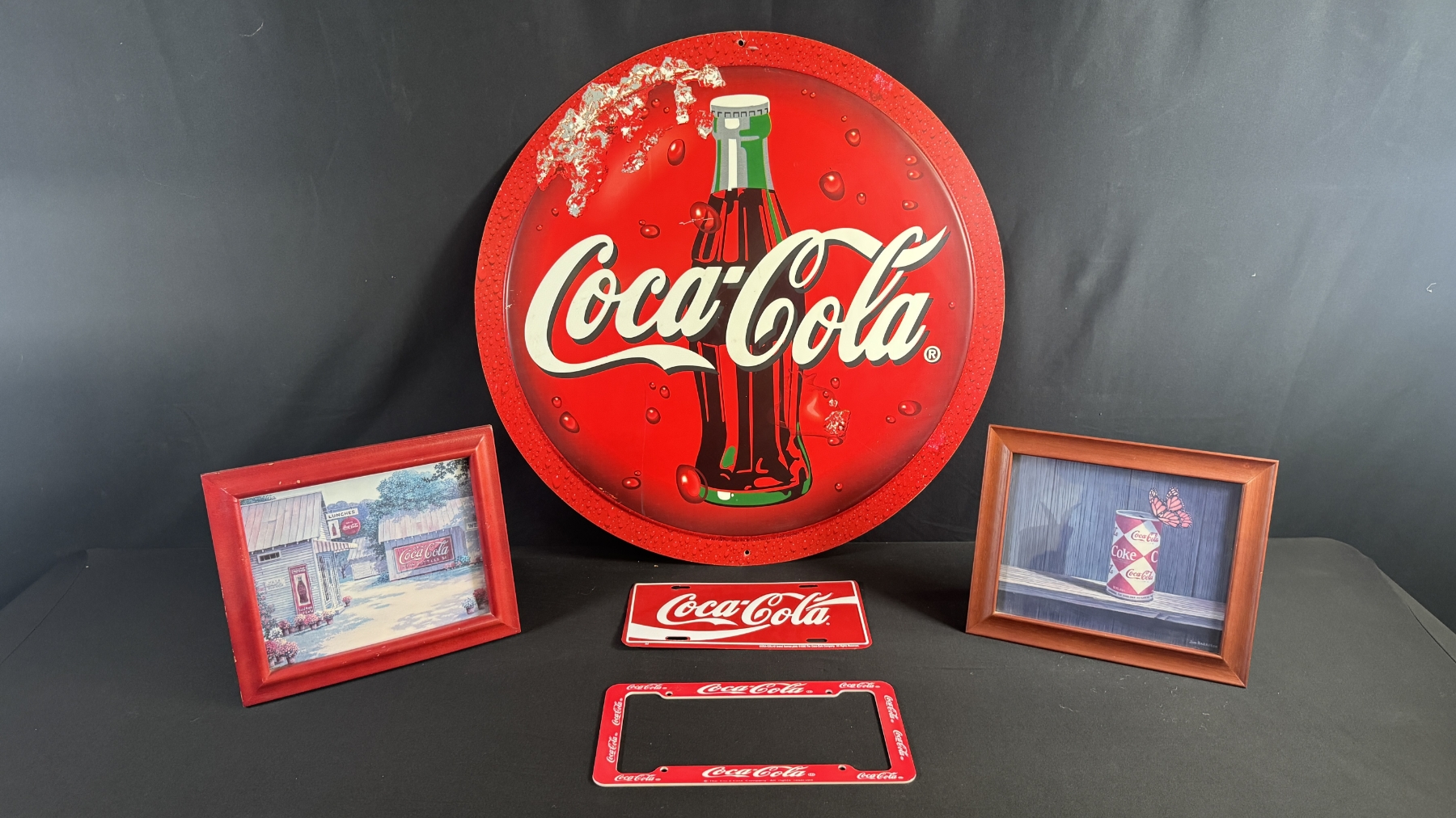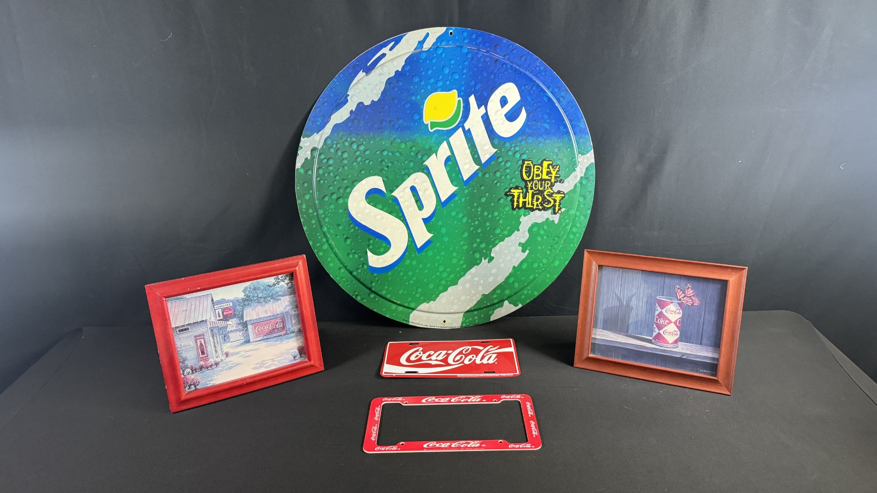 LARGE DOUBLE-SIDED COKE/SPRITE SIGN 28" DIAMETER, FRAMED PRINTS & LICENSE PLATE W/ COVER