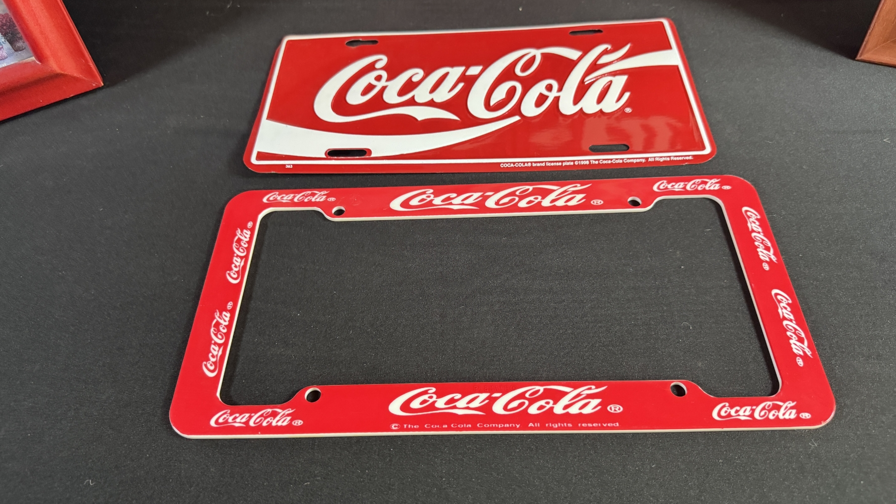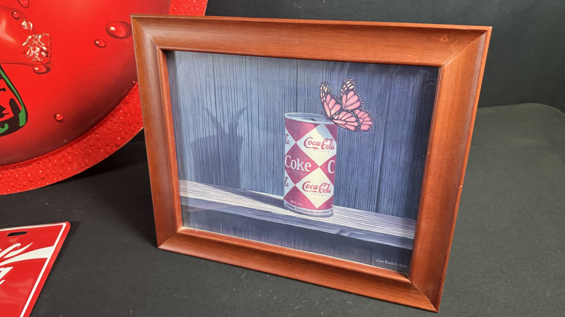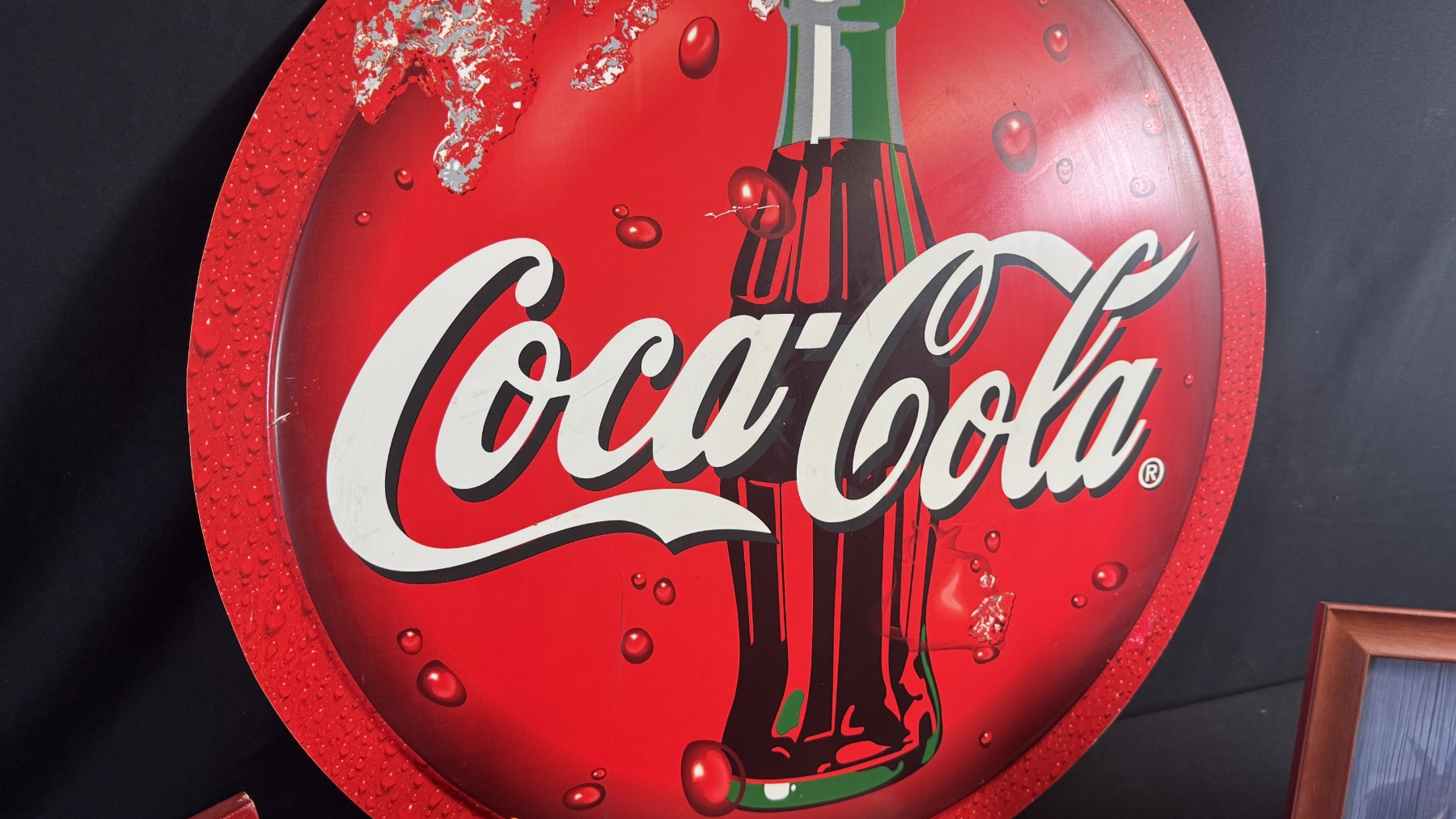 LARGE DOUBLE-SIDED COKE/SPRITE SIGN 28" DIAMETER, FRAMED PRINTS & LICENSE PLATE W/ COVER