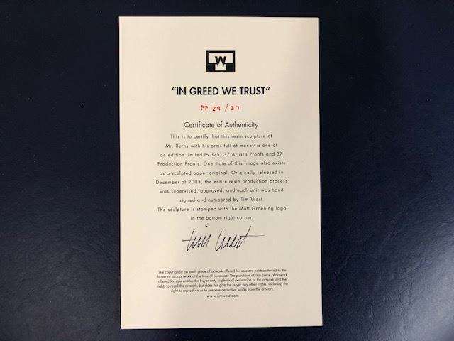 LIMITED EDITION! SIMPSONS RESIN SCULPTURE OF MR.BURNS. SIGNED AND NUMBERED BY TIM WEST. INCLUDES COA
