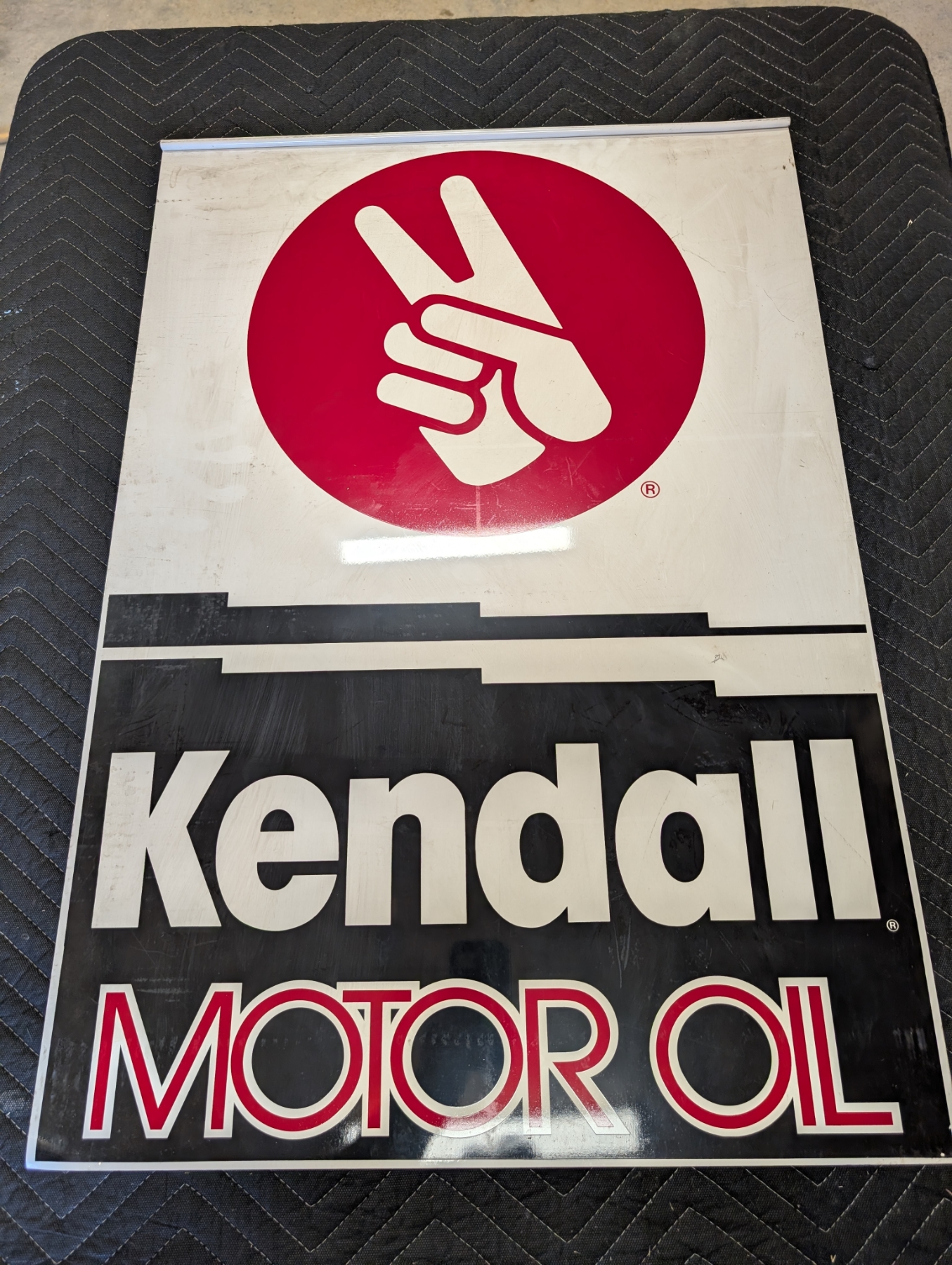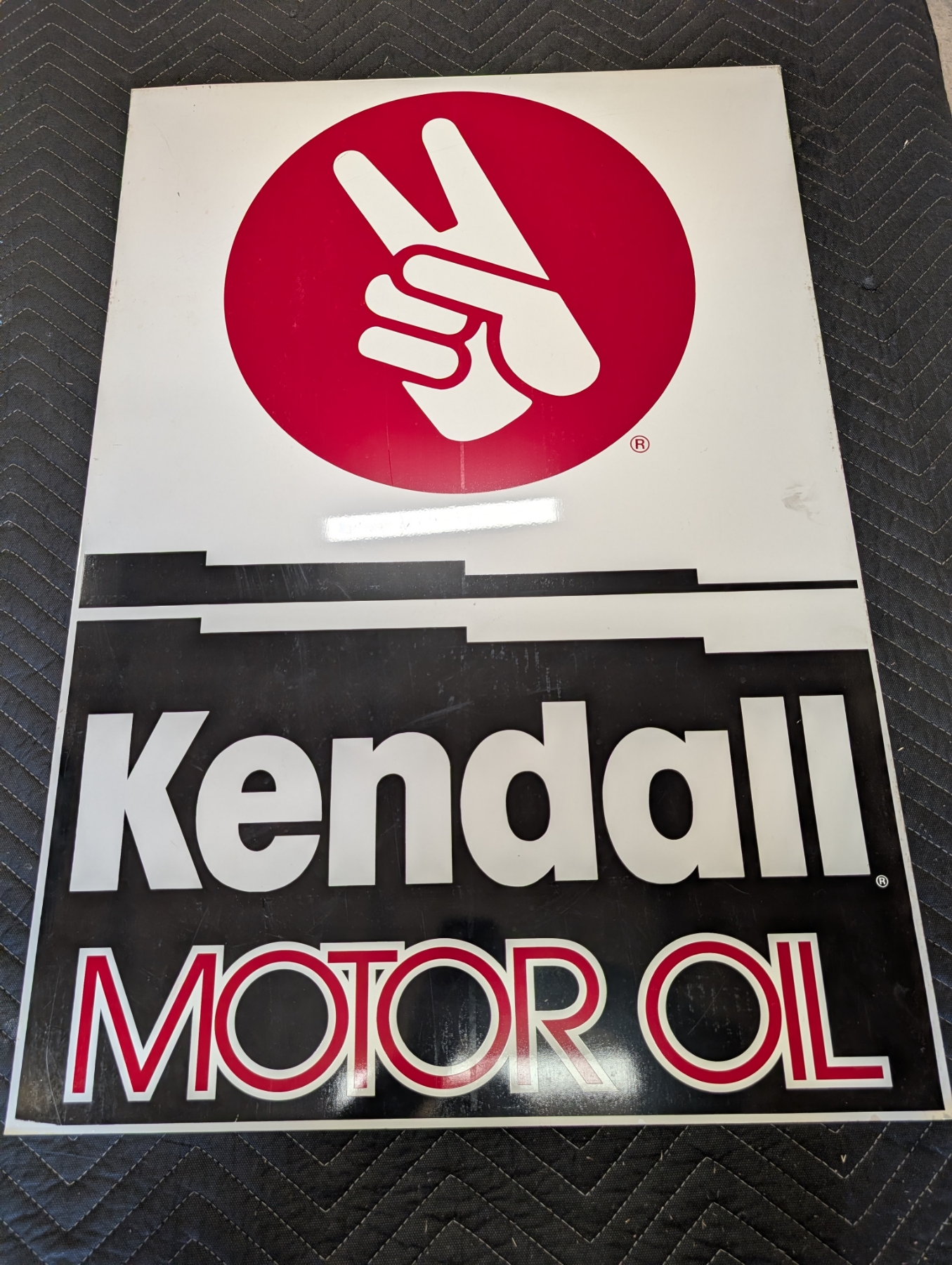 New old stock NOS in original box KENDALL oil swinging/hanging metal sign. Sign is double sided. New and never mounted with original bracket and hardware included. Original box and packaging included. Size of sign not including bracket is 2 foot by 3 foot.