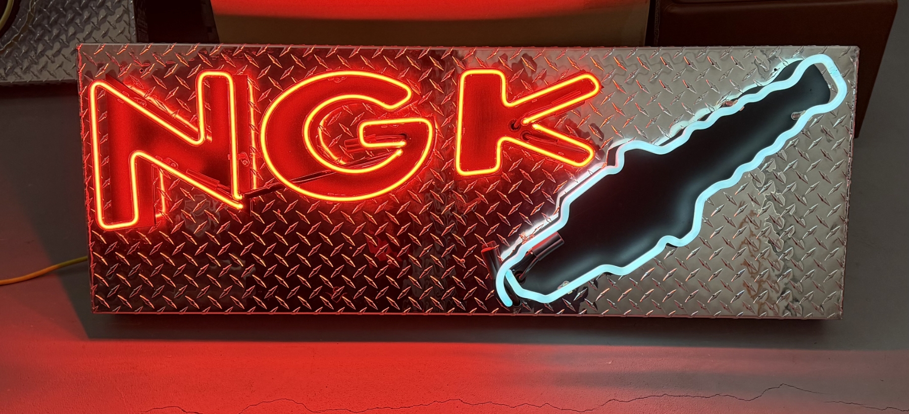 17” high x 48” long x 3” deep 1/16” aluminum checker plate. Neon glass mounted to checker plate with transformer mounted on back. 120v