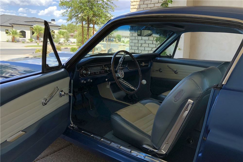 Stunning - 1965 Ford Mustang Fastback GT350 re-creation beautifully finished in Acapulco Blue with white GT 350 stripe package and Shelby-style wheels. Original matching-numbers 289ci V8 engine with a Toploader 4-speed manual transmission and a 4-barrel carburetor. Manufactured in San Jose, resided in California and southern Utah. Restoration done several years ago. Body is very straight, panels all have a great fit. This Mustang has the GT350 trim package upgrades, which include badging, stripe package, dual exhaust, engine compartment performance upgrades and Shelby-style rims. Full custom professionally installed interior that includes two-tone blue-and-white upholstery, new carpet, console, custom door panels, fold-down rear seat and teak steering wheel. Chassis is clean and presentable, as is the engine compartment.