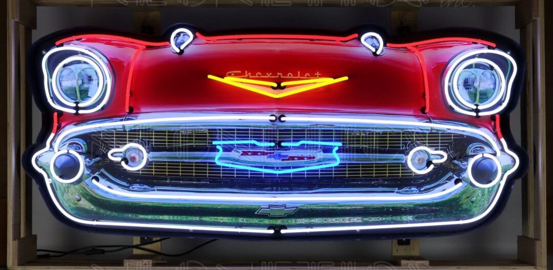 NO RESERVE 57 CHEVY BEL AIR GRILL NEON SIGN IN STEEL CAN
