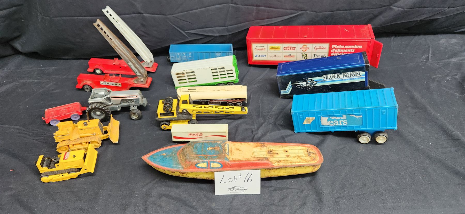 Assortment of metal and plastic vintage toy tractor trailers with vintage tin boat and Tonka bulldozer