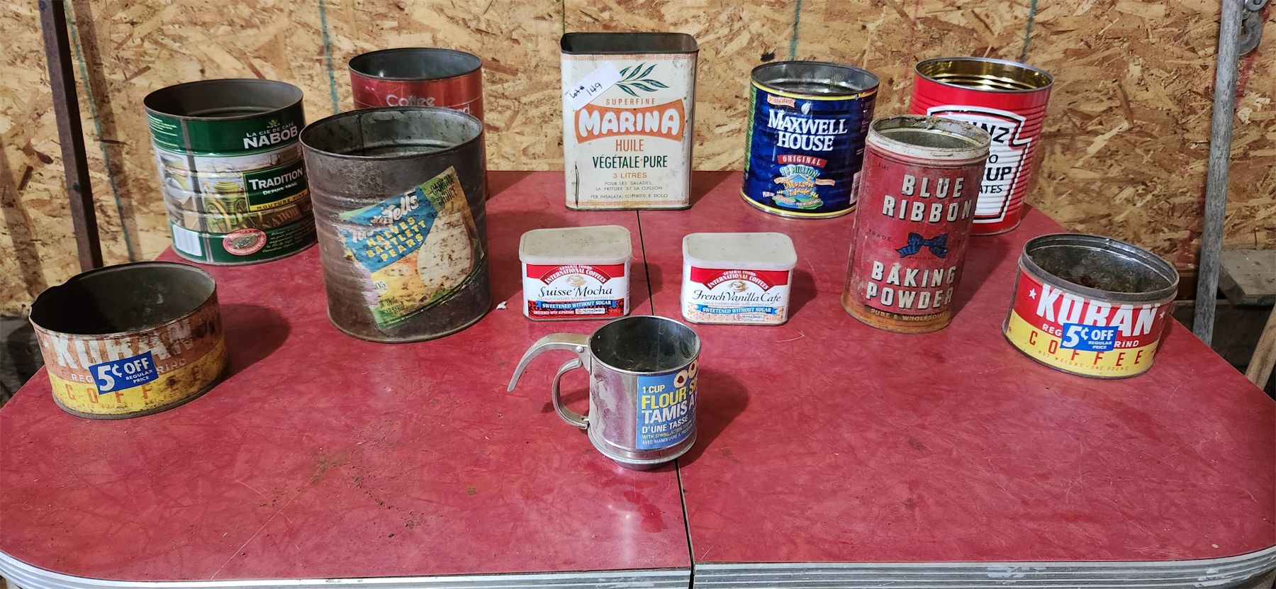 Collection of old coffee and baking cans , 1 vintage flour shifter