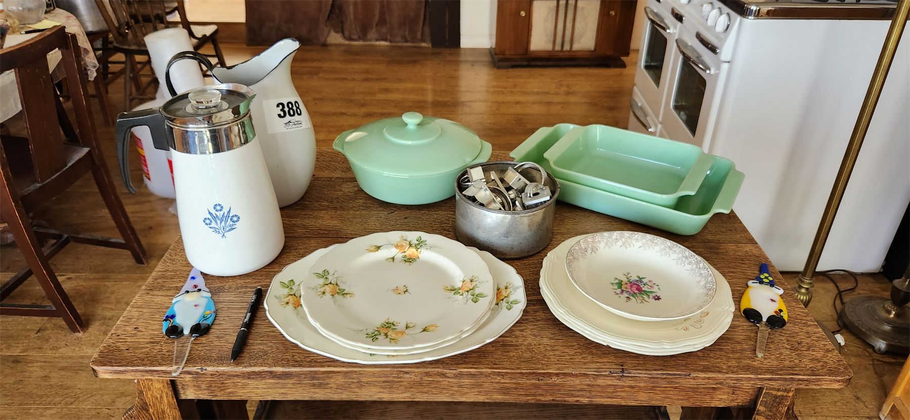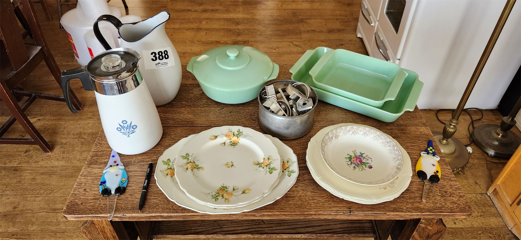 NO RESERVE Collection of vintage trays, water jug ,3 replica jadeite pieces, misc cookie cutters