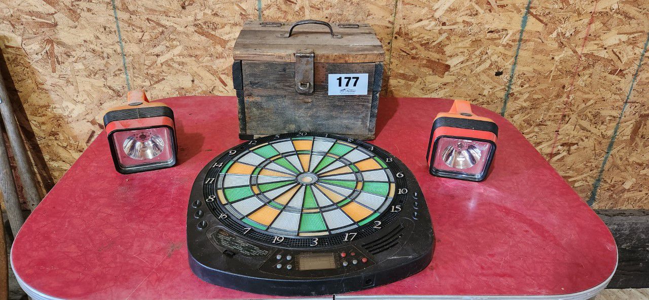 Digital dart board with 2 flashlights and vintage wooden tool box