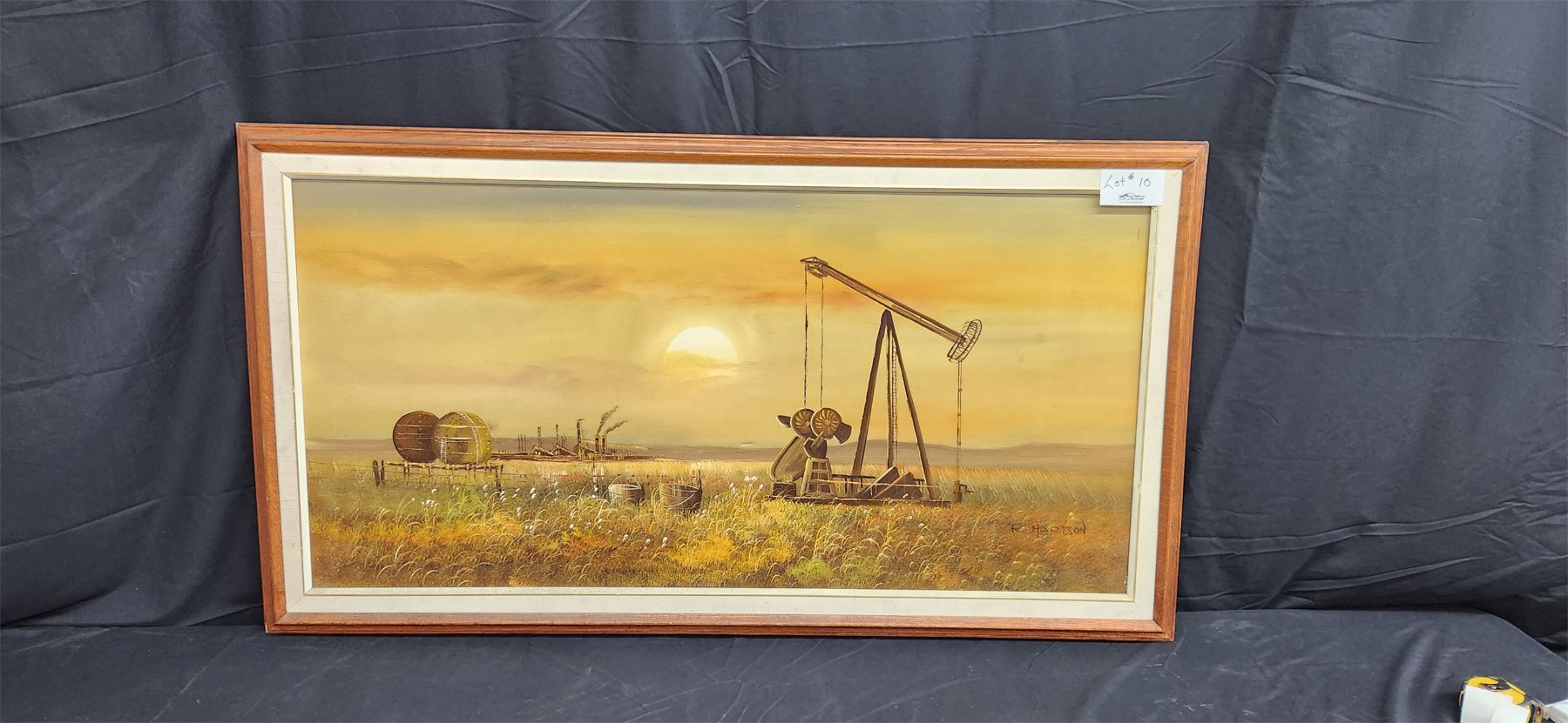 Large oil painting of pump jack on prairies measures 52 inches by 30 inches