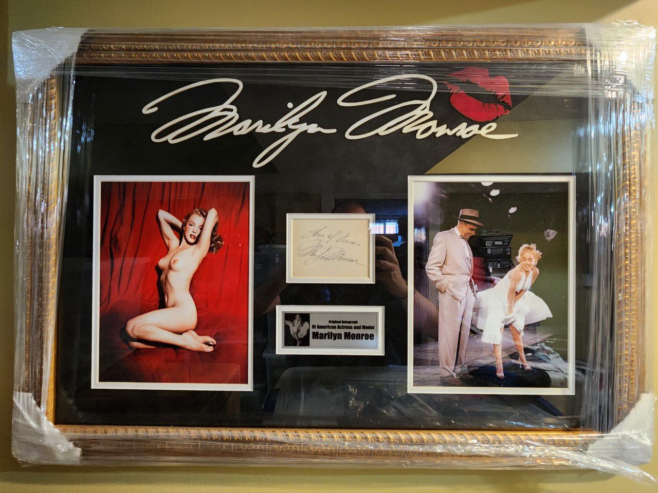 Has any woman been more romanticized, copied, and admired than Marilyn Monroe? The epitome of sexy, she starred in countless movies, became a cultural icon, was the first woman featured in Playboy Magazine, and was even rumoured to have had an affair with JFK before her early death. This piece is beautifully framed with a patterned gold frame, suede matting featuring insets of both her famous 'blowing skirt' photo and one of her famous nude photos, as well as a laser cut suede logo of her stylized name. Comes with certificate of authenticity. Approximate value $5000