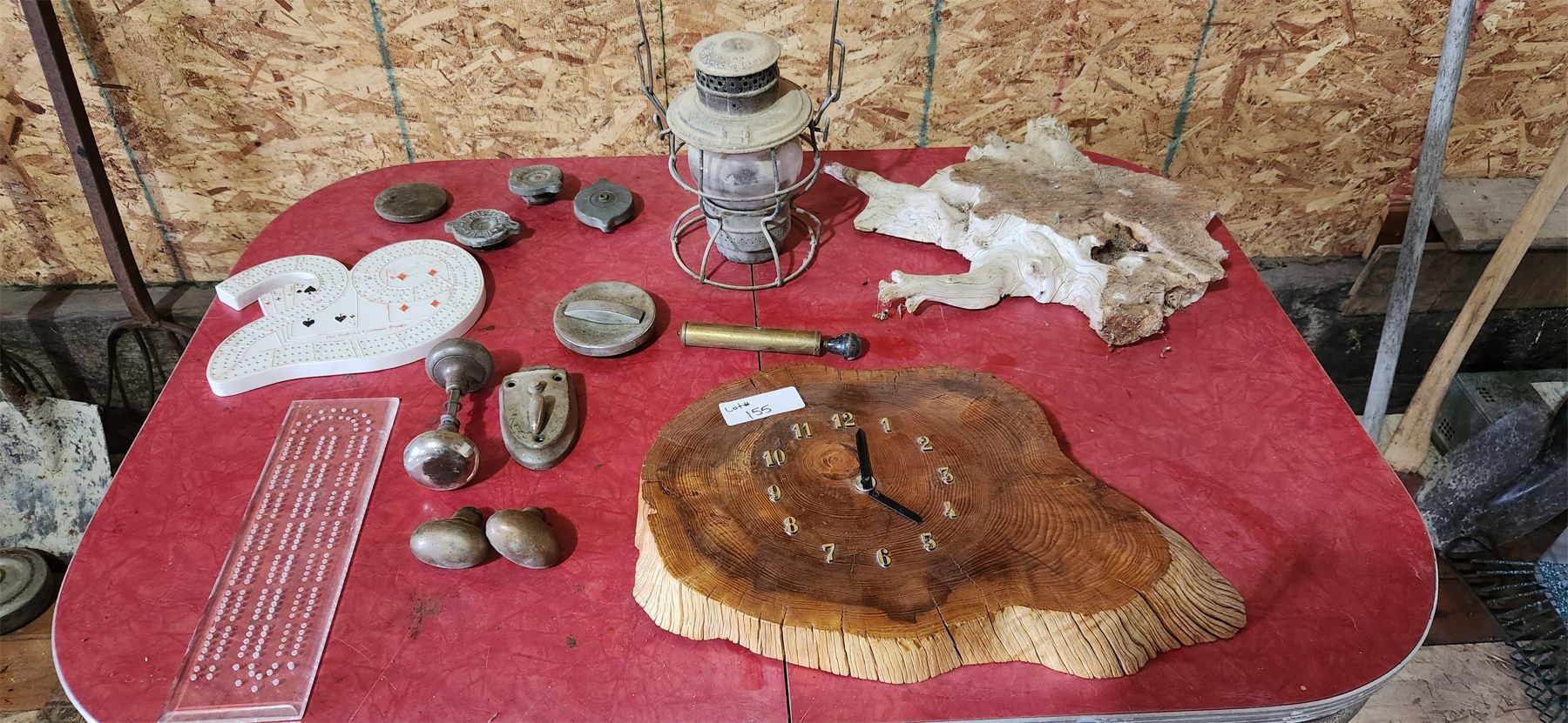 Misc items , vintage door knows, crib boards , vintage lantern ,clock (needs motor to run) wood to make another clock