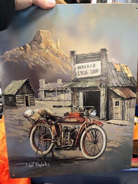 NO RESERVE NAVAJO CYCLE SHOP SIGN FEATURING VINTAGE INDIDAN MOTORCYCLE BY TED BLAYLOCK