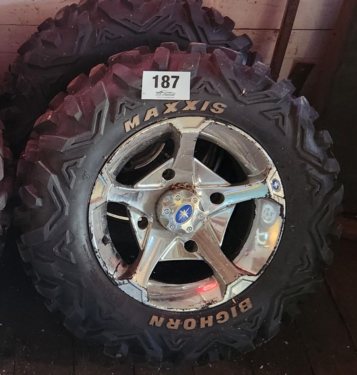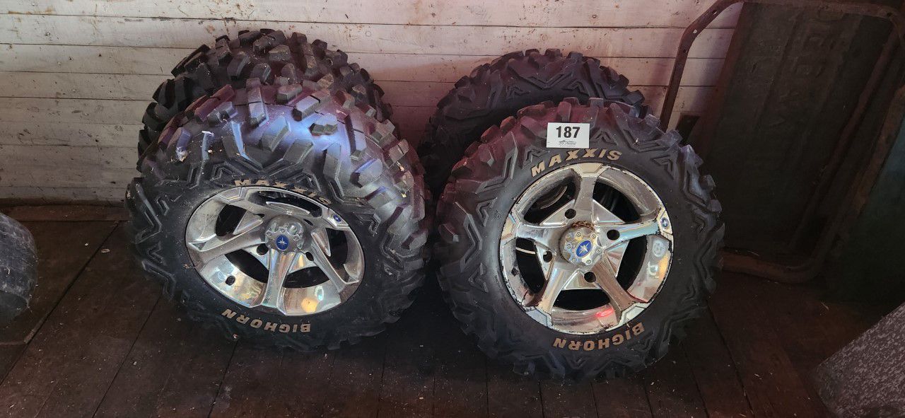 Set of 4 side by side tires and rims. Size At26X9R14
