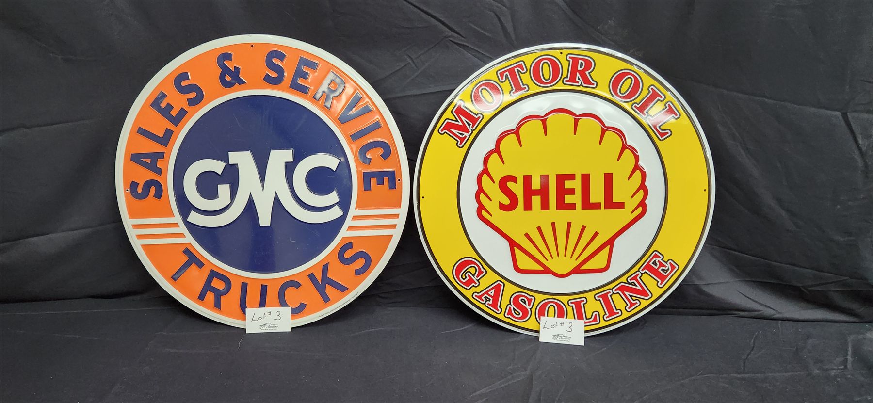 Two 1 sided metal signs GMC Sales and Shell Gasoline both measure 2ft by 2ft