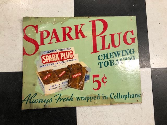 NO RESERVE VINTAGE SPARK PLUG CHEWING TOBACCO COLLECTIBLE SIGN