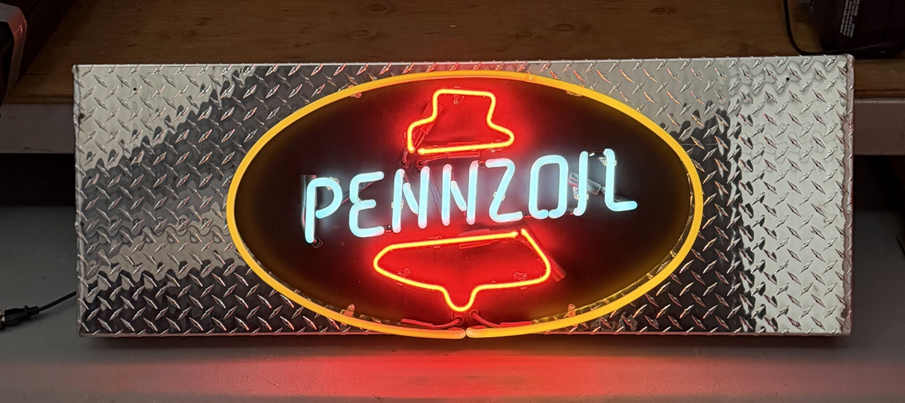 17” high x 48” long x 3” deep 1/16” aluminum checker plate. Neon glass mounted to checker plate with transformer mounted on back. 120v