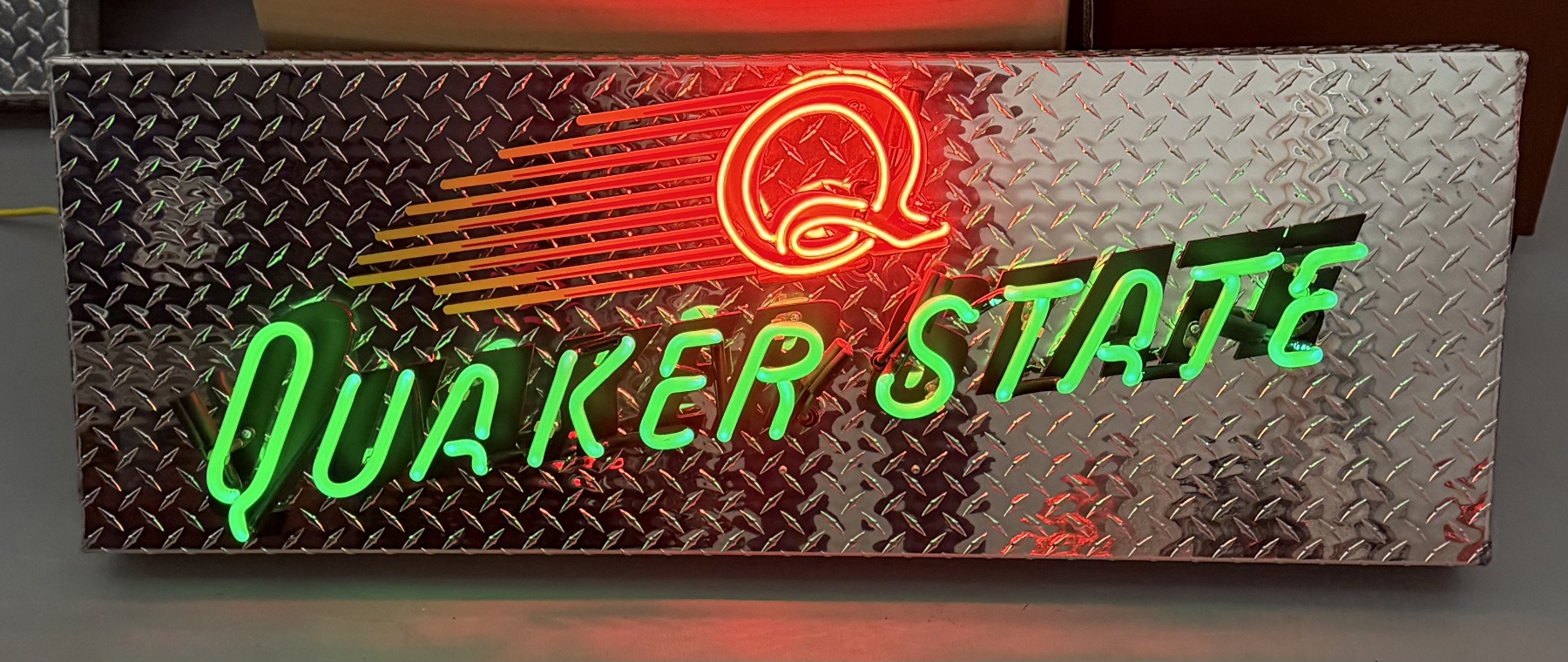 17” high x 48” long x 3.5” deep 1/16” aluminum checker plate. Neon glass mounted to checker plate with transformer mounted at the back. 120v