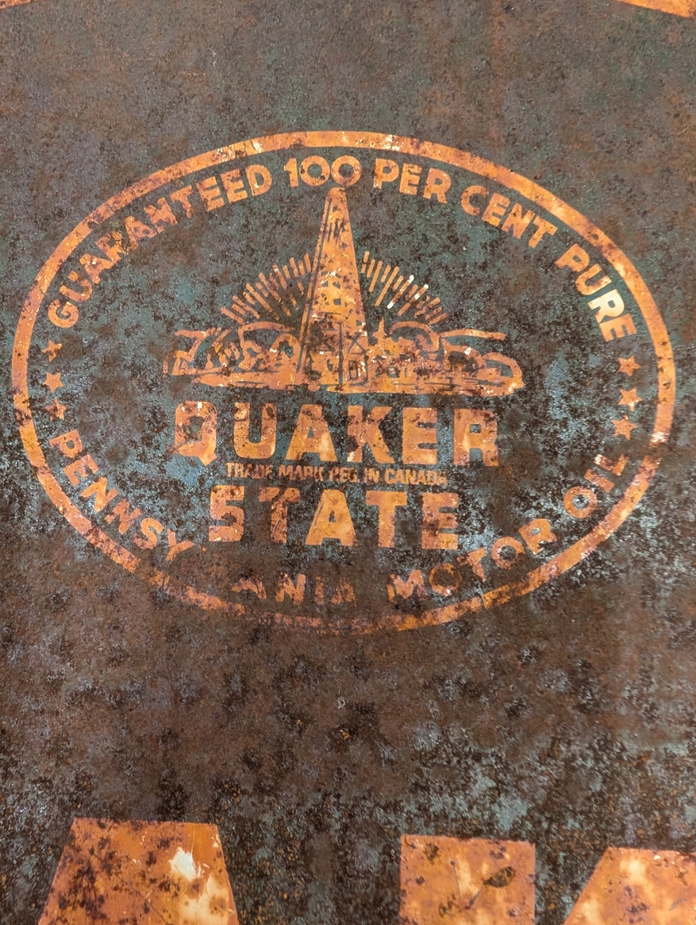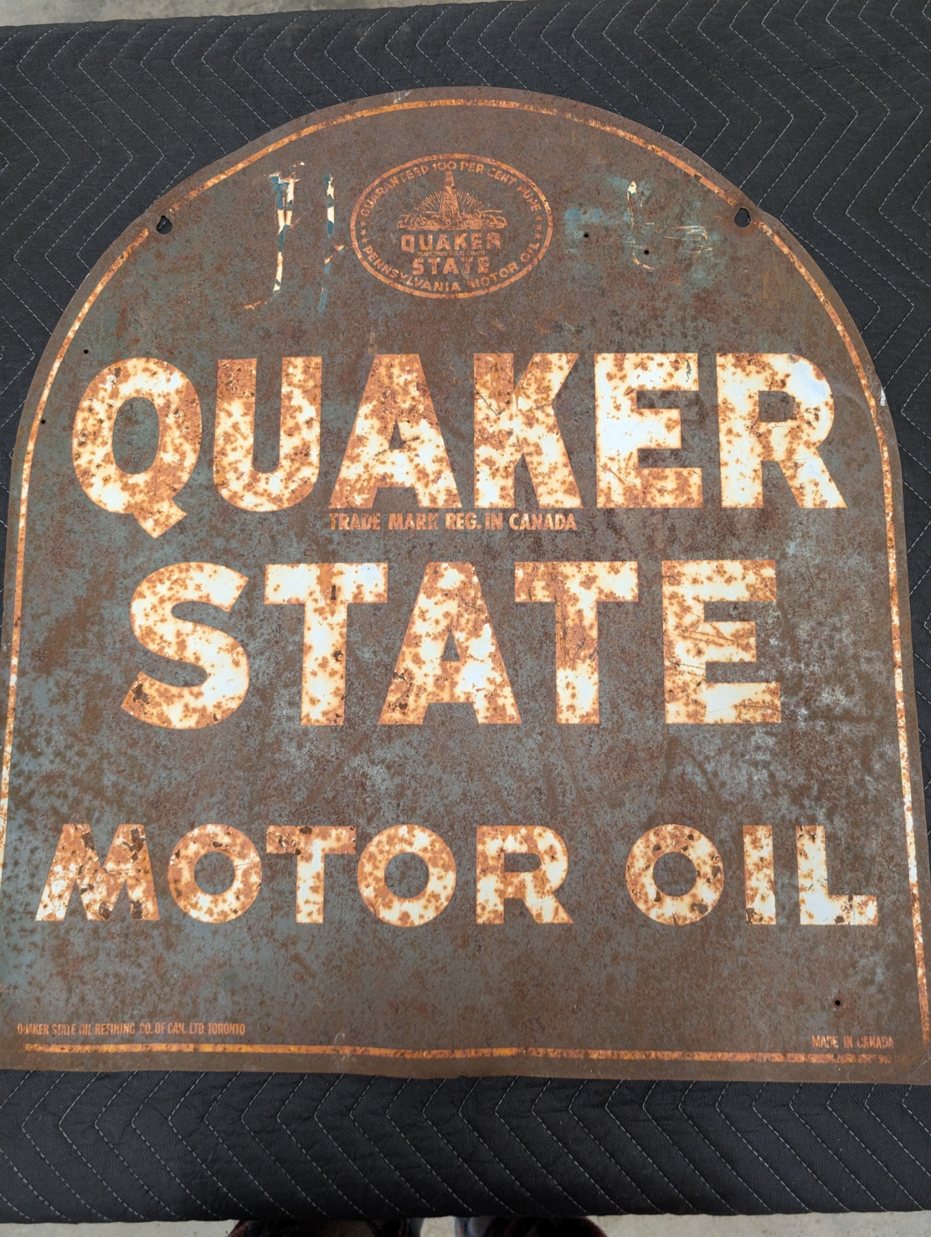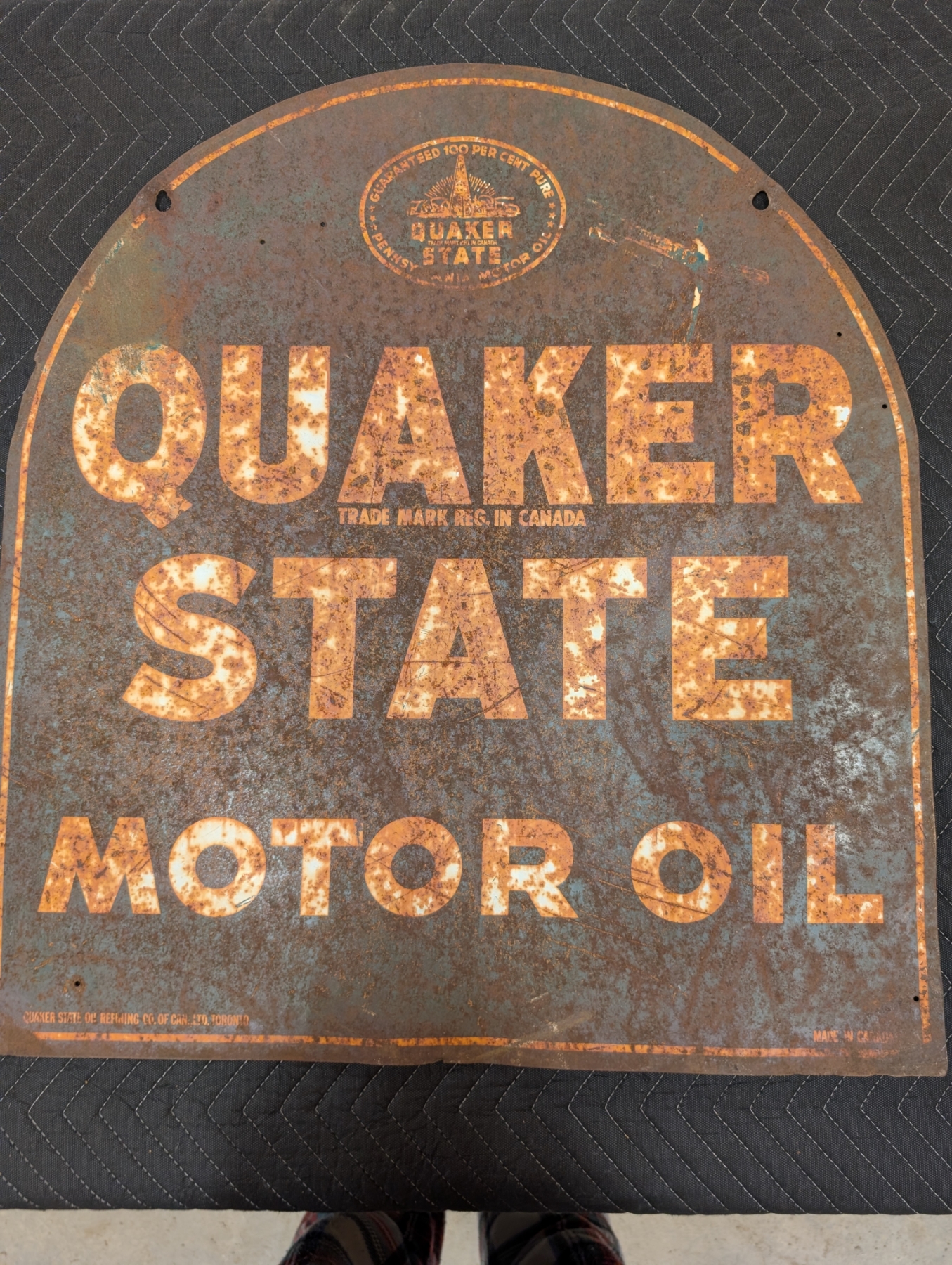 Early patina Quaker State heavy painted metal Tombstone hanging sign! Made in Toronto, Canada! Measures 29 inches by 26.5 inches! Made for Canadian market!
