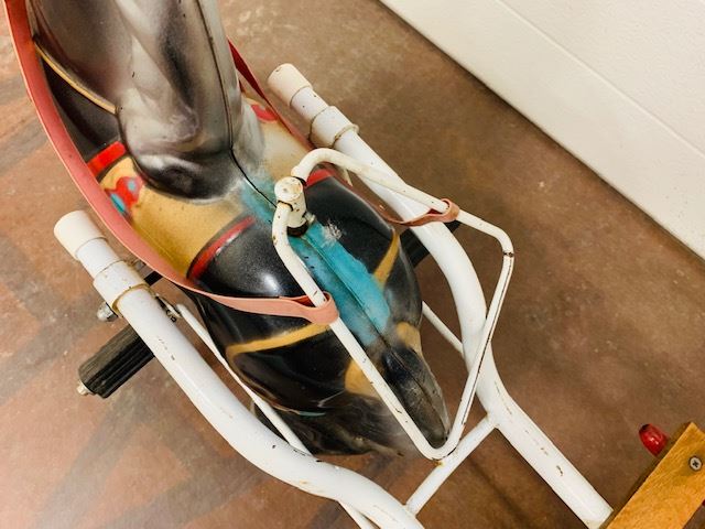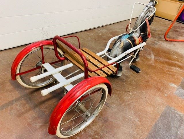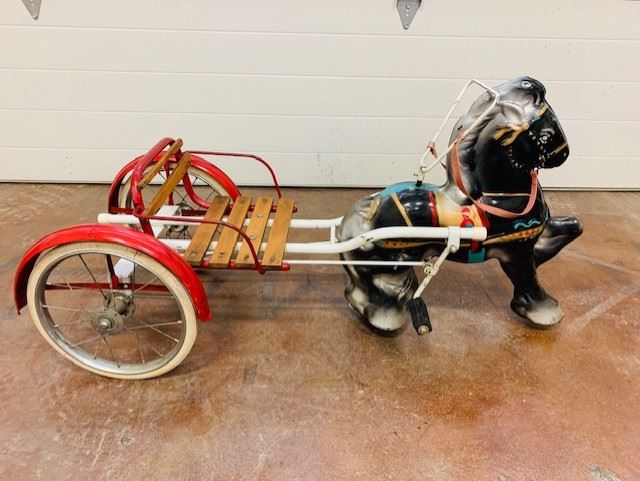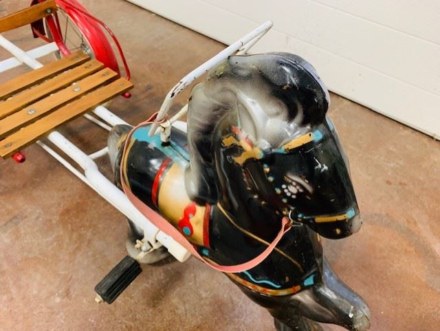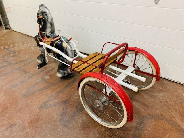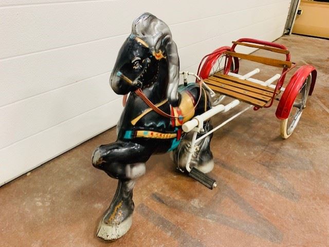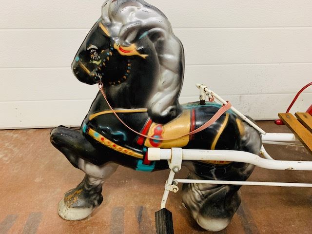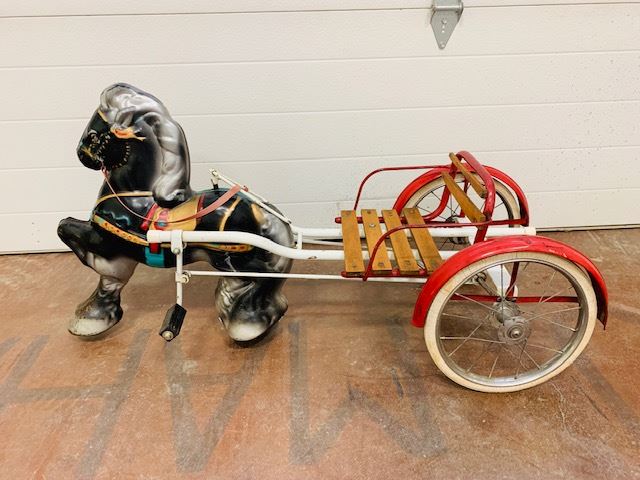 RARE! 1940s VINTAGE HORSE AND BUGGY PEDAL CAR. WOODEN SEAT METAL HORSE.
