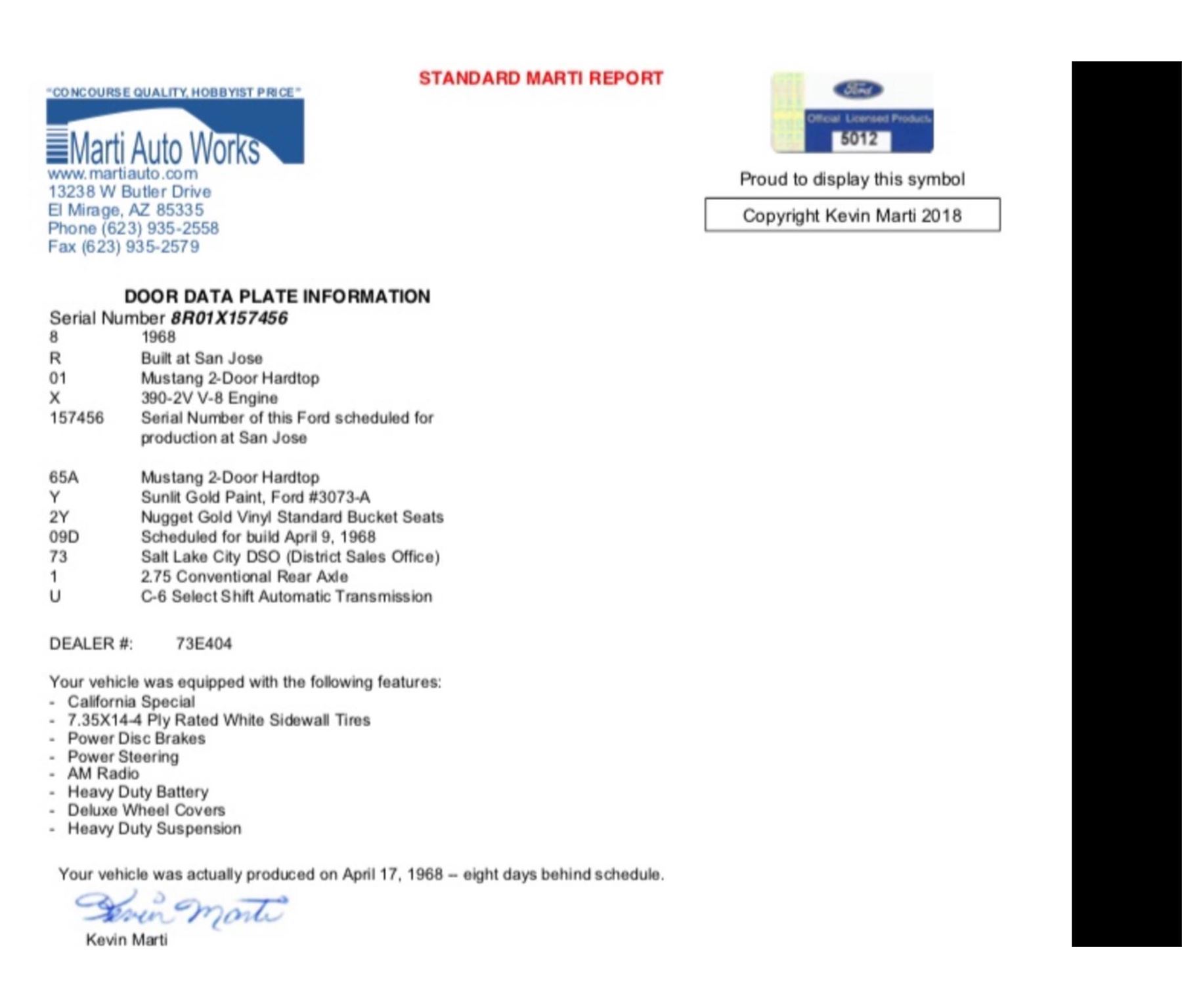 MARTI REPORT DOCUMENTS THE AUTHENTICITY OF THIS RARE ONE OF A KIND CAR