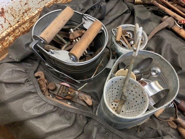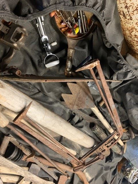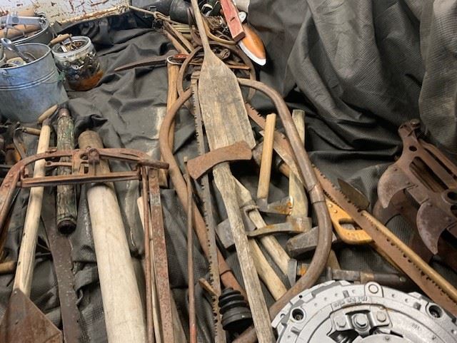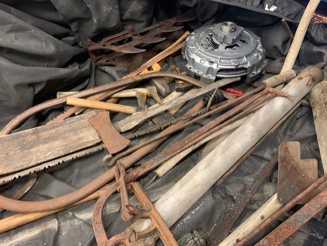 TRUCK BED FULL OF ANTIQUE EQUIPMENT
