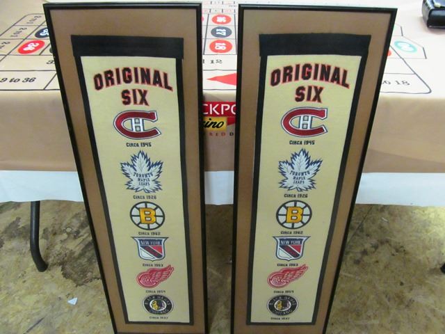TWO ORIGINAL 6 LARGE FRAMED BANNERS - MONTREAL,TORONTO, BOSTON, NEW YORK, DETROIT, CHICAGO
