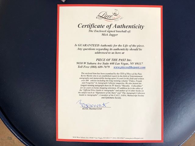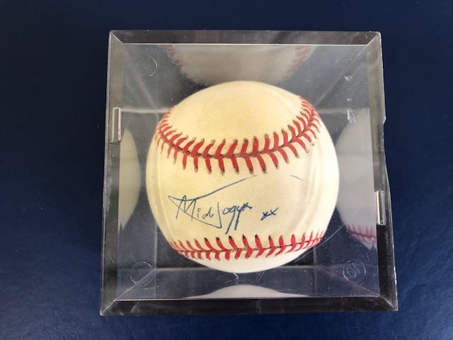 VINTAGE AUTOGRAPHED BASEBALL SIGNED BY THE ROLLING STONES FRONT MAN MICK JAGGER. WITH COA
