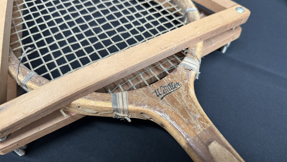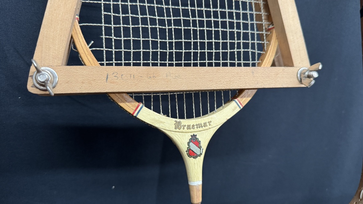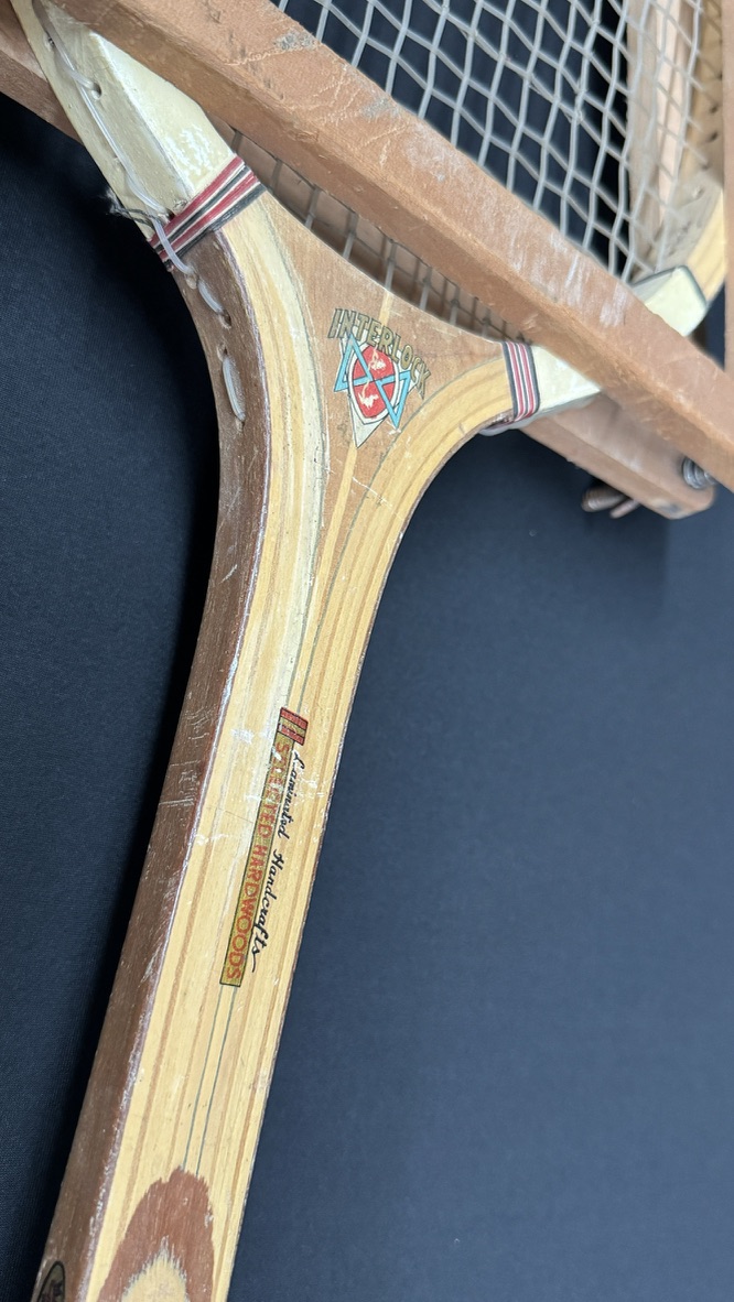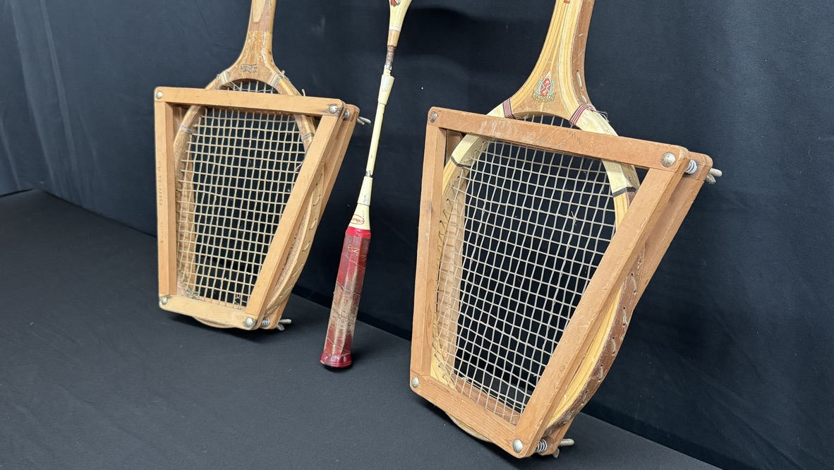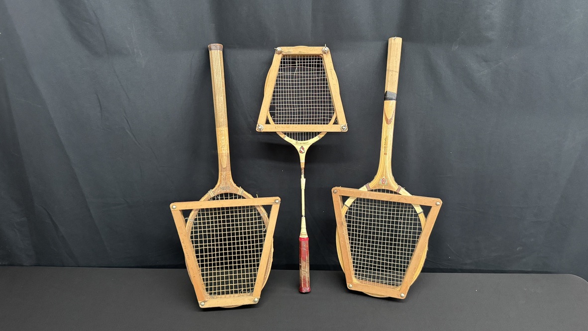 VINTAGE WOODEN TENNIS RACQUETS & BADMINTON RACQUET W/ PRESS FRAMES